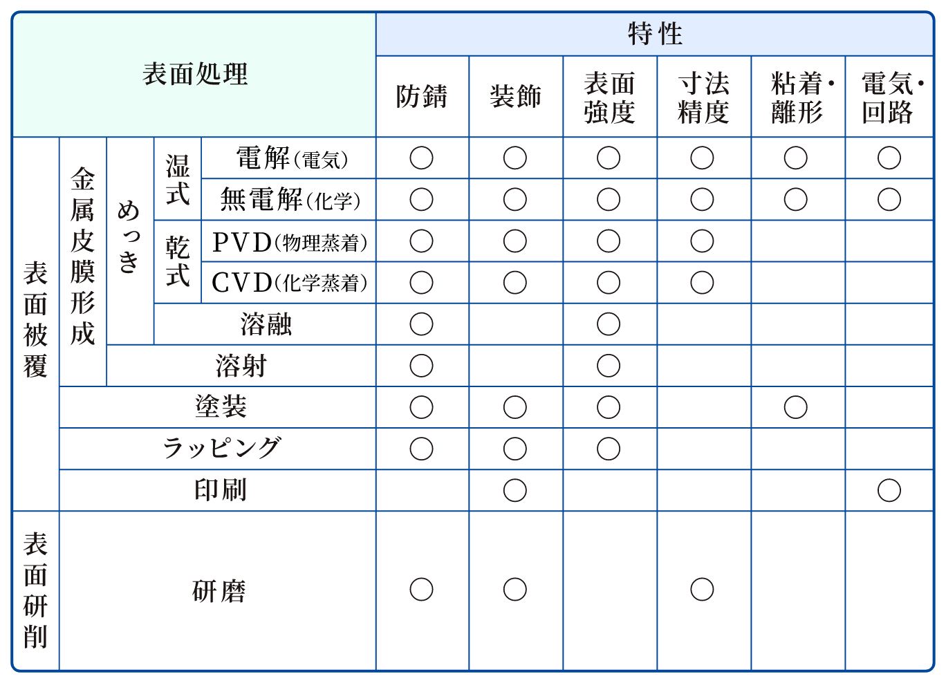 めっきはその主要な方法の一つです。下の動画及び図に、表面処理の種類と特性を大まかにまとめました。