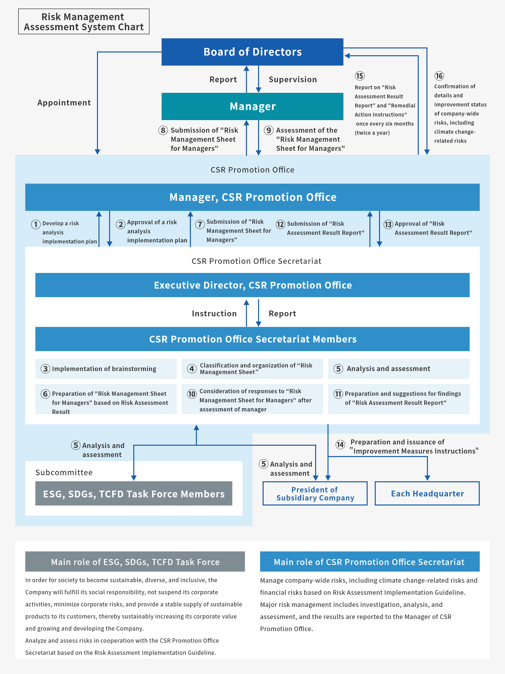 At the Company, managers are responsible for all risk management, and we have established a Compliance (CSR) Promotion Office. The authority to implement all risk management except assessments by managers has been delegated to CSR Promotion Office. CSR Promotion Office manages company-wide risks, including climate change-related risks, and financial risks in accordance with the Risk Management Regulations and the Risk Assessment Implementation Guideline, and managers assess them. In addition, we have established an ESG, SDGs, TCFD Task Force as a subcommittee of CSR Promotion Office, and in cooperation with the CSR Promotion Office Secretariat, it identifies, assesses and manages comprehensively environmental and social risks, including climate change-related risks, based on the Risk Management Regulations and the Risk Assessment Implementation Guideline. The matters discussed in CSR Promotion Office as well as the rates of achievement and state of progress of ESG, the SDGs and TCFD are reported to the Board of Director every six months (twice a year). And with these twice-yearly reports, the Board of Directors manages the progress of climate change-related risks and monitors the state of handling of risks that it has continuously identified.