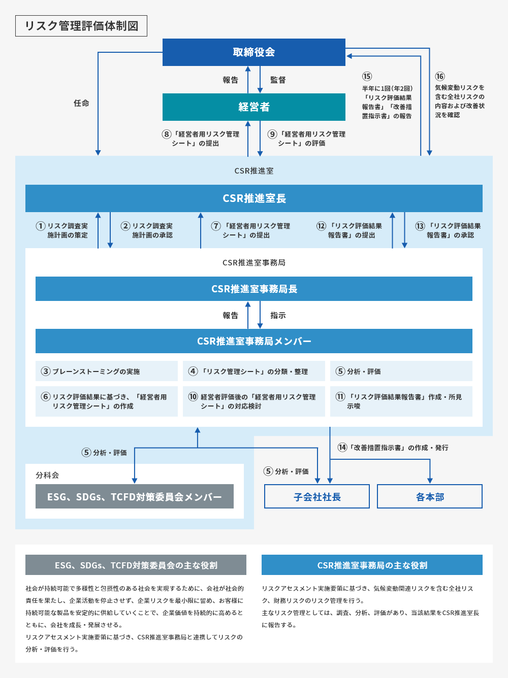 当社では経営者が全てのリスク管理の責任を負い、 「コンプライアンス(CSR)推進室」を設け、当該リスク管理における経営者評価を除く全ての実施権限をCSR推進室長へ委譲しています。 「CSR推進室」はリスク管理規程及びリスクアセスメント実施要領に基づき、気候変動関連リスクを含む全社リスク・財務リスクのリスク管理を行い、経営者がこれの評価を行います。