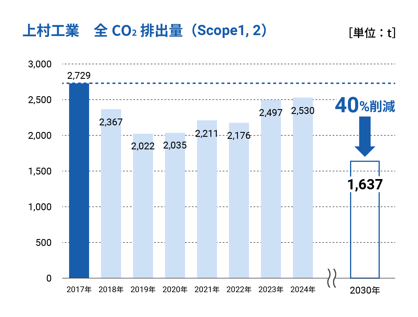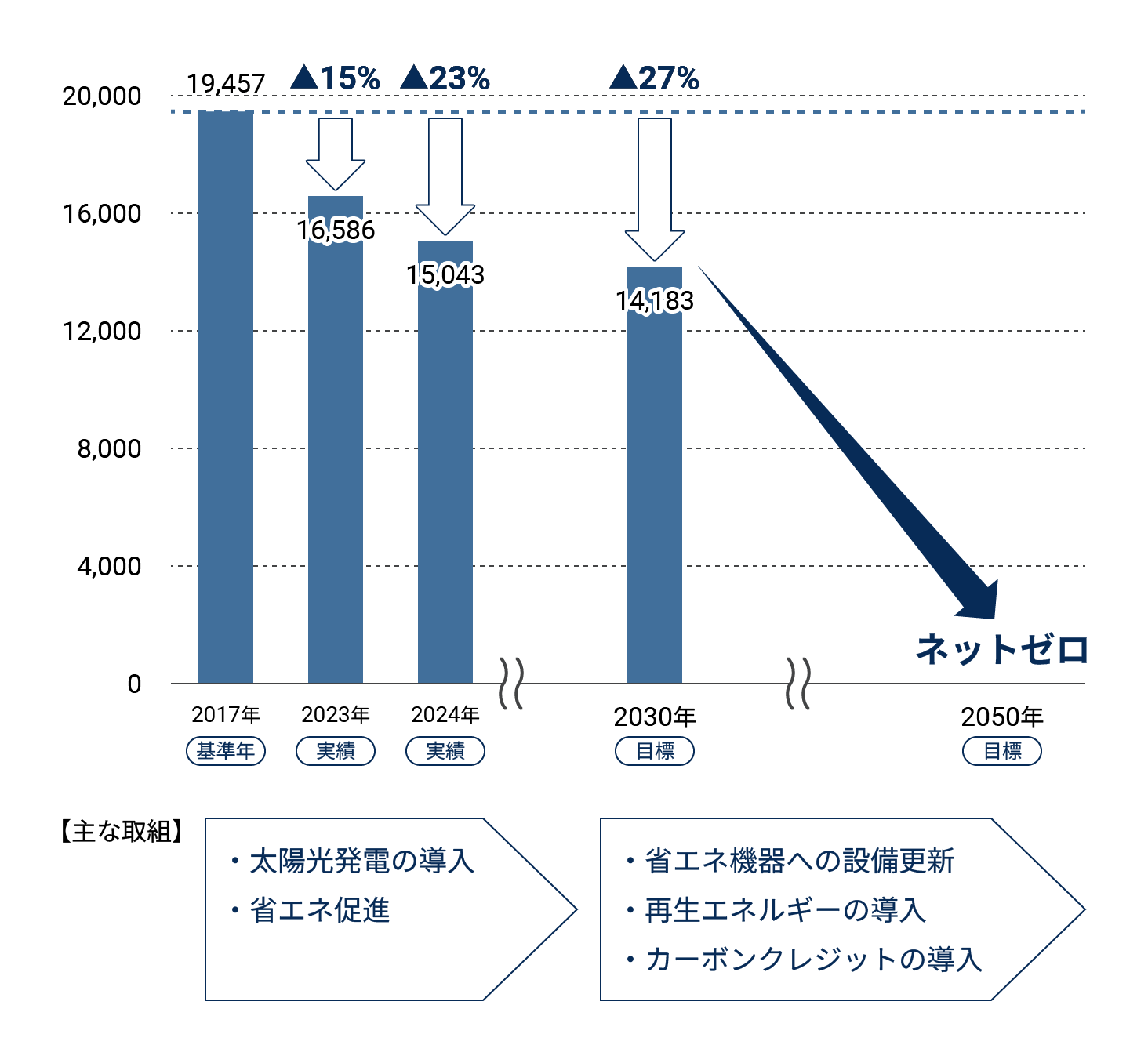 当社グループでは、環境目標の中で「CO2排出量の削減」を目標として設定し、CO2排出量の削減に取り組んでいます。2030年までに当社グループのCO2排出量27%削減(日本国内40%、海外25%削減)を目指します。(2017年比)